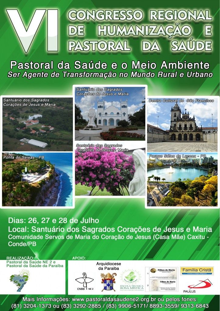 O VI Congresso Regional de Humanização e Pastoral da Saúde acontecerá no Santuário dos Sagrados Corações de Jesus e Maria, Caxitu – Conde/PB, com tema Pastoral da Saúde e o Meio Ambiente e lema Ser Agente de Transformação no Mundo Rural e Urbano. Realizado pela Pastoral da Saúde Ne 2 e Pastoral da Saúde da Paraíba.