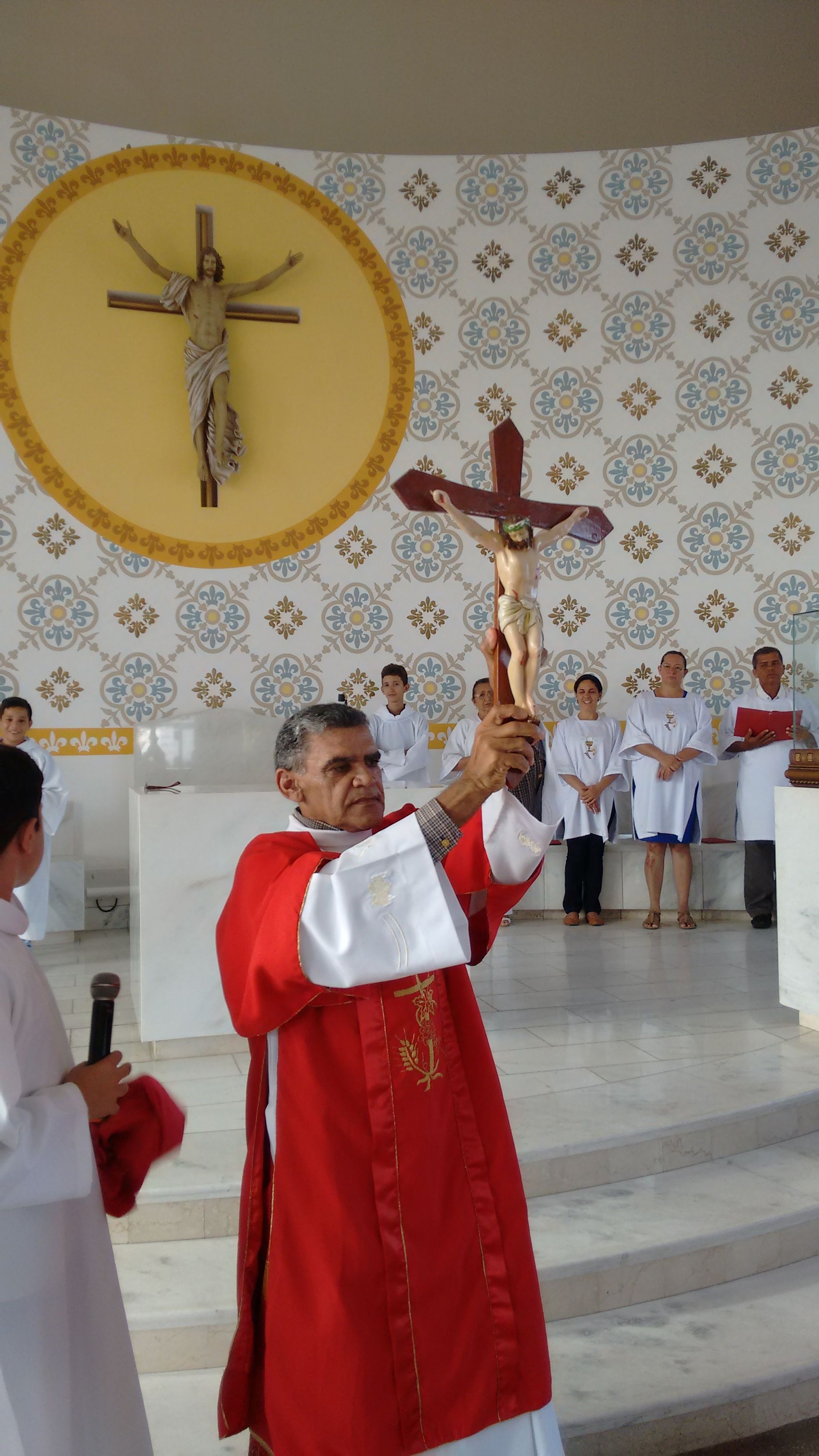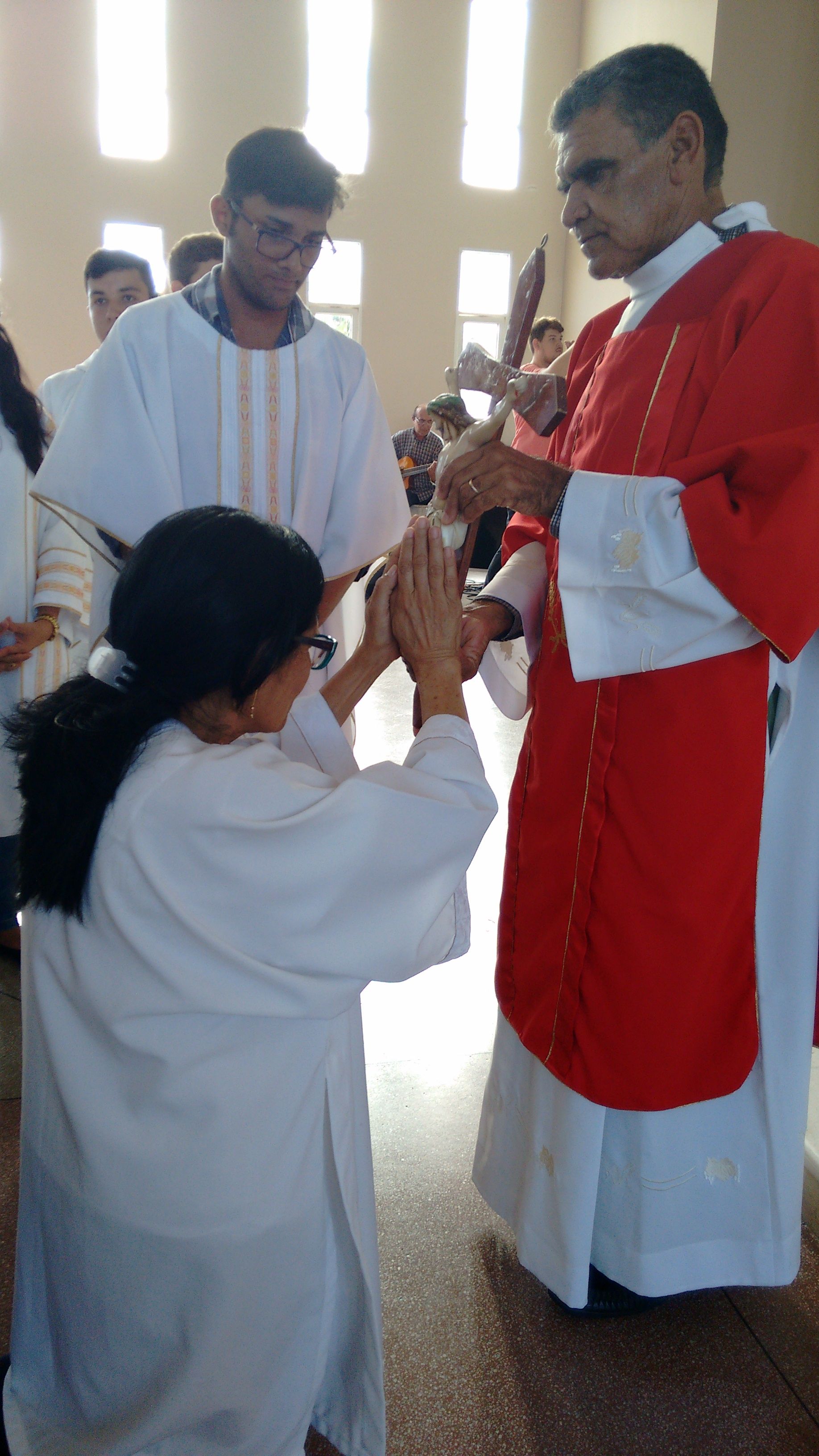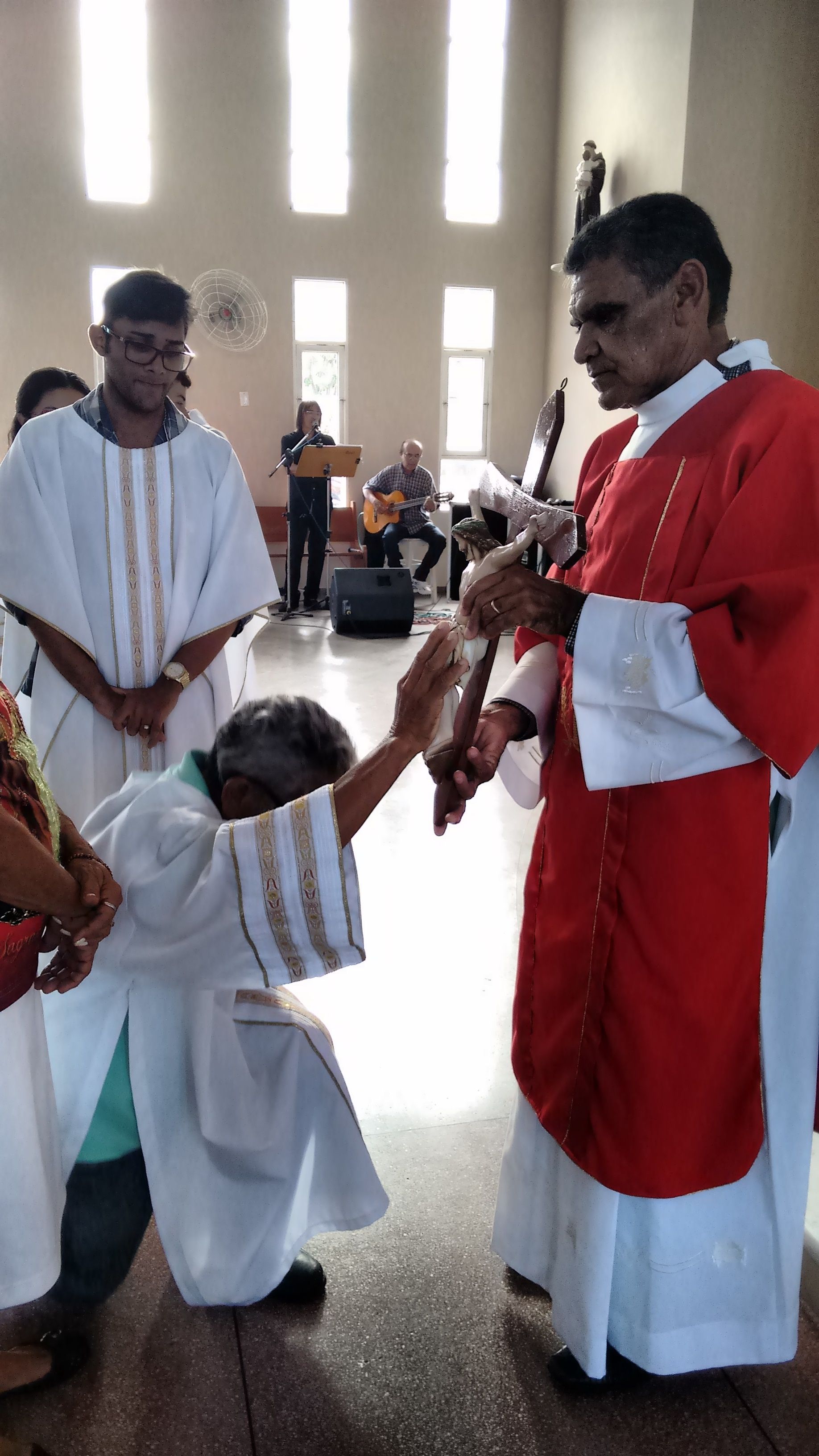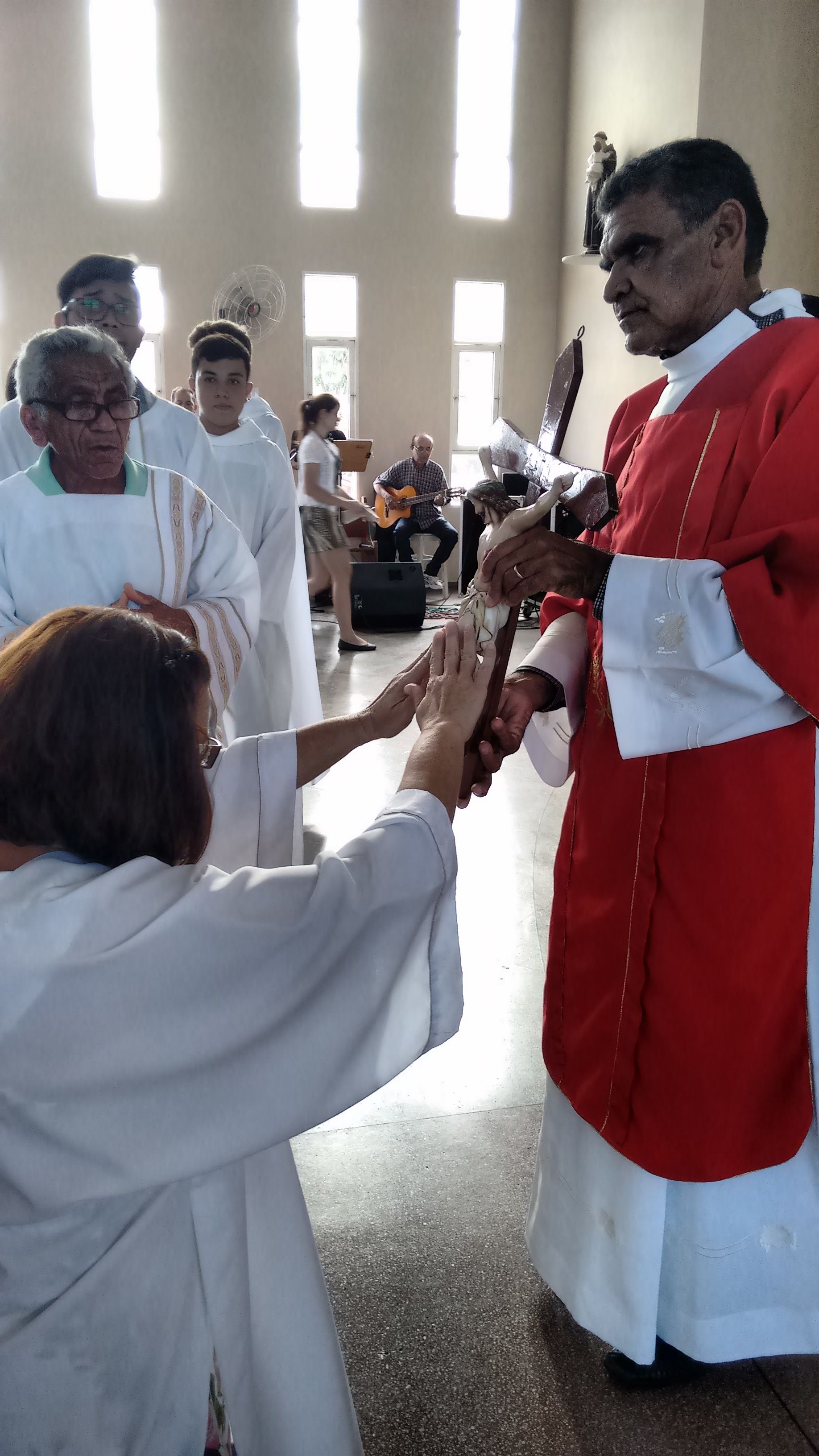 A Comunidade de Nossa Senhora Aparecida atendendo ao chamado, se reuniu, nesta Sexta-feira Santa, dia 25 de Março, para celebrar a Paixão de Cristo. O Diácono Roberto presidiu a celebração e, em sua homilia, diz: “hoje, celebrando o mistério da cruz, eu tenho que olhar cada passo, meditar sobre cada circunstância, meditar sobre cada instante dessa passagem para, dentro de mim, também refletir o que vai ser, o que vai dar continuidade, o que vai dar sentindo a minha vida. Naquela corrida até o calvário, cada passo que Jesus dava com aquele madeiro nas costas, Ele ia se lembrando de cada um de nós, Maria, Marta, José, Antônio, Severino... e ia salvando. Cada um dos nossos nomes Ele se lembra, porque Ele tem o nome de cada um de nós escrito em Seu coração”.