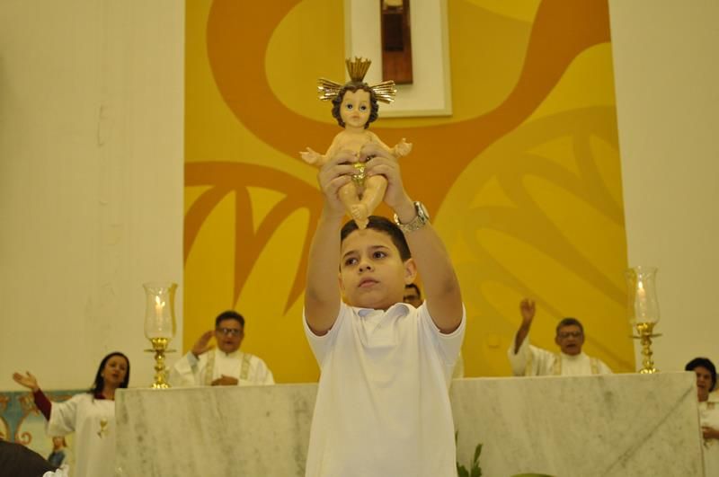 Pontualmente ás 19:00hs a Celebração Solene do Natal do Senhor teve inicio com Pe. Alixandre Presidindo sendo Concelebrada pelos Diáconos Permanentes Roberto e Rossini. No momento de cantar o Glória crianças que participam da missa das crianças entraram pela nave central da igreja com sinos anunciando a chegada do salvador do mundo, logo em seguida uma criança trazia a imagem do Menino Jesus sendo ladeado por dois anjinhos até o presépio montado na lateral do presbitério.