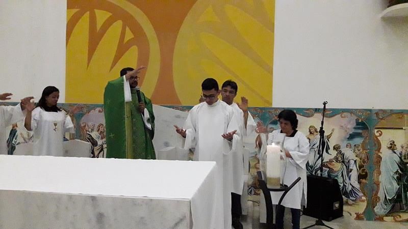 Às 19:00 a Celebração Eucarística teve inicio, com Pe. Alixandre Presidindo, logo no inicio Pe. Alixandre como Pároco acolheu o Jovem Luciano como vocacionado agora como seminarista.