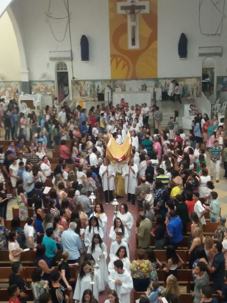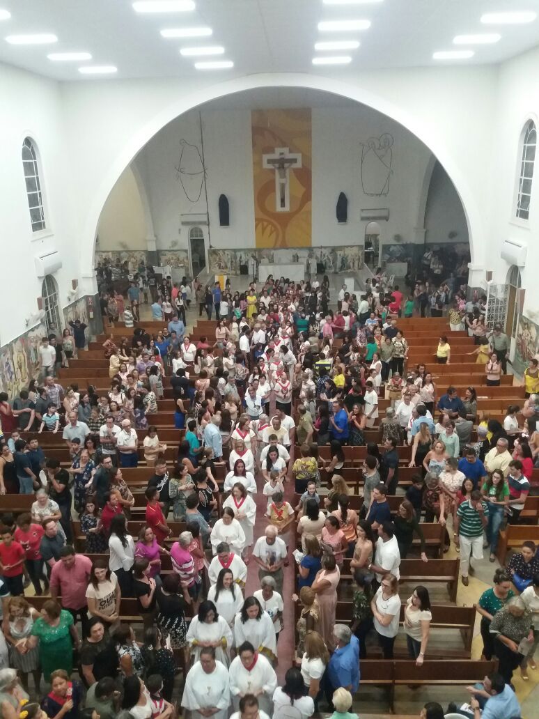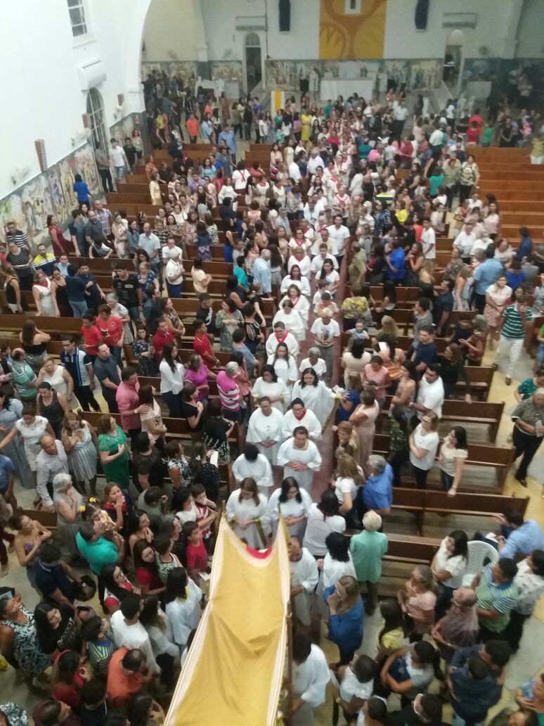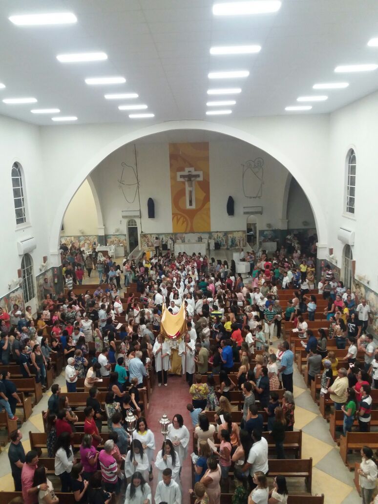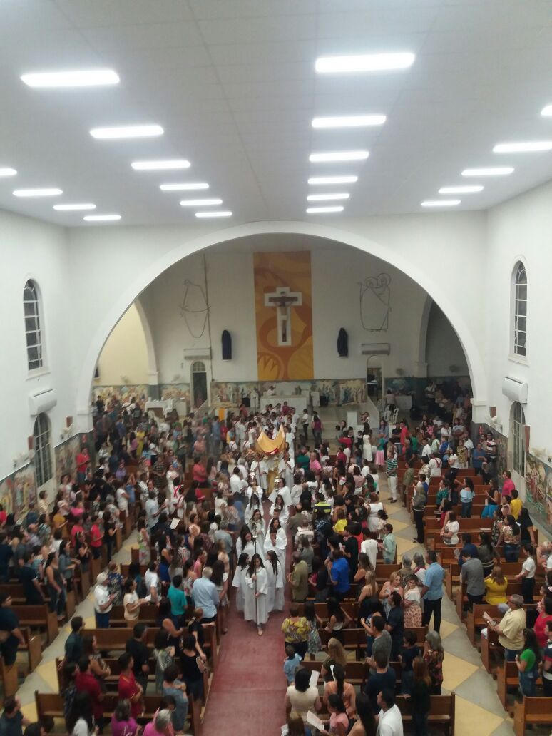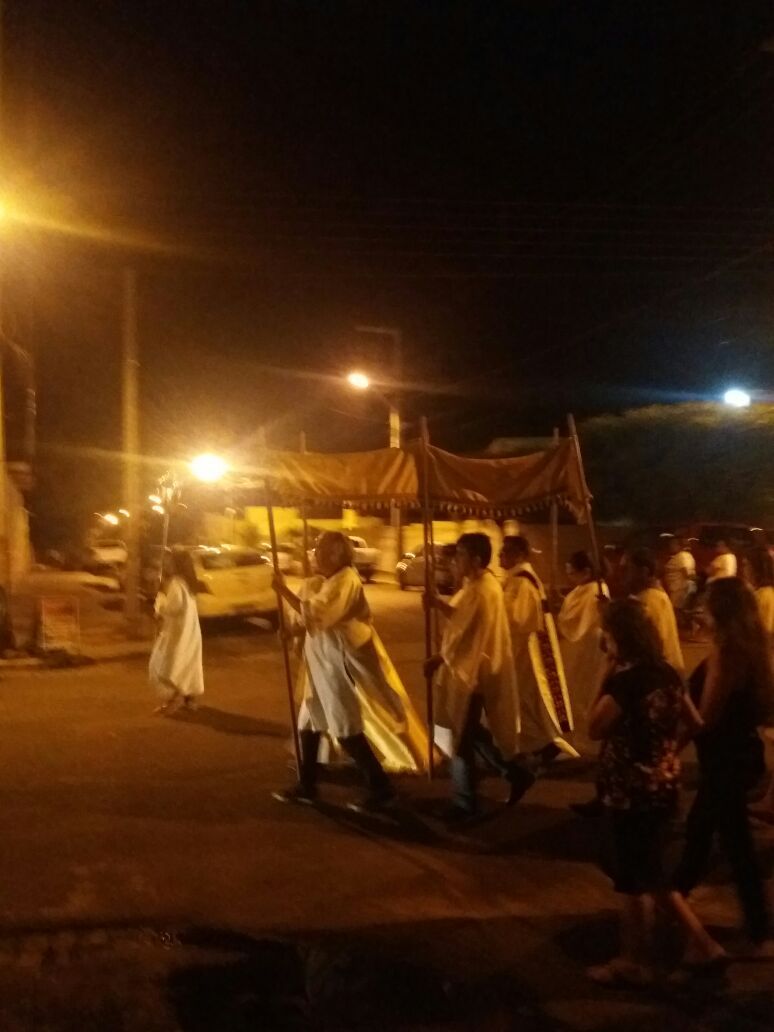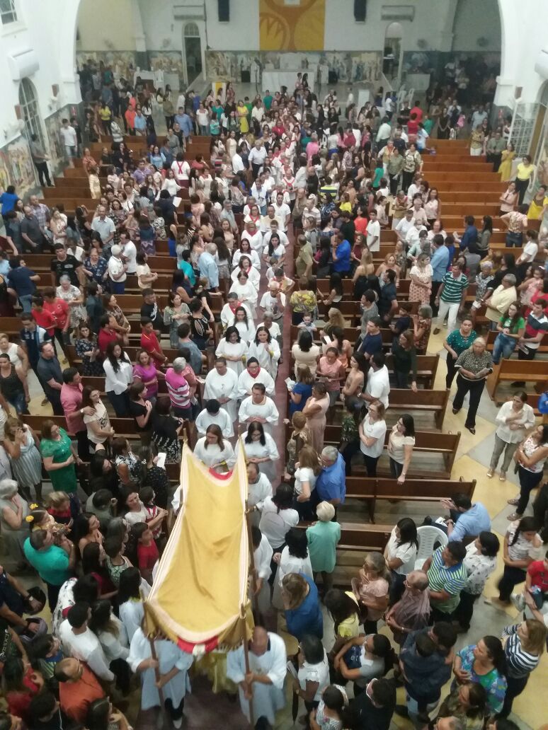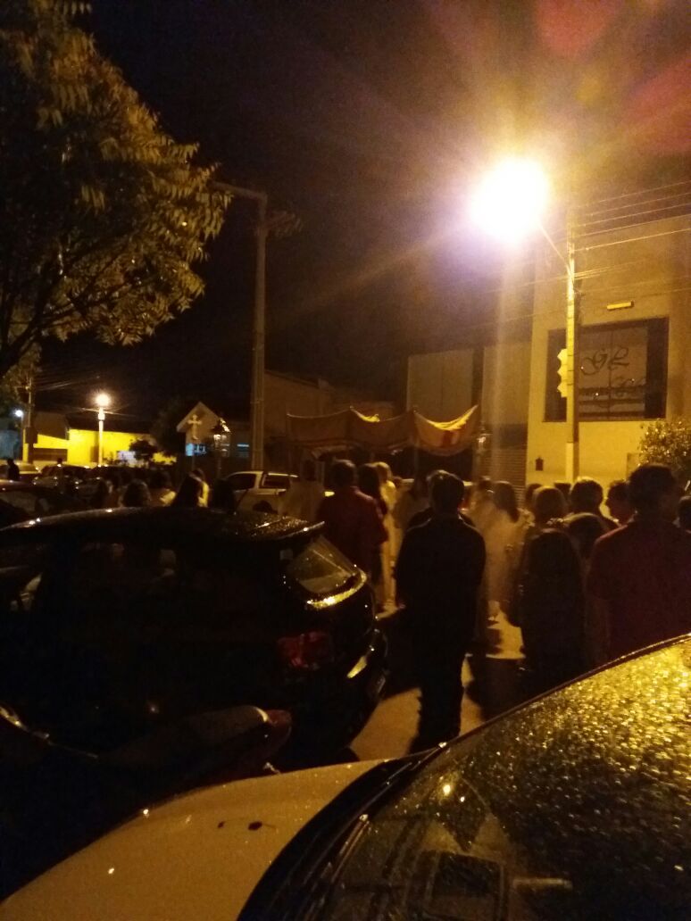 Após a comunhão em momento de profundo siléncio e oração as reservas eucaristicas foram retiradas do Sacrário e foram transladadas em procissão com todos os fieis presentes em direção ao salão paroquial onde ficou em Adoração até as 23hs.