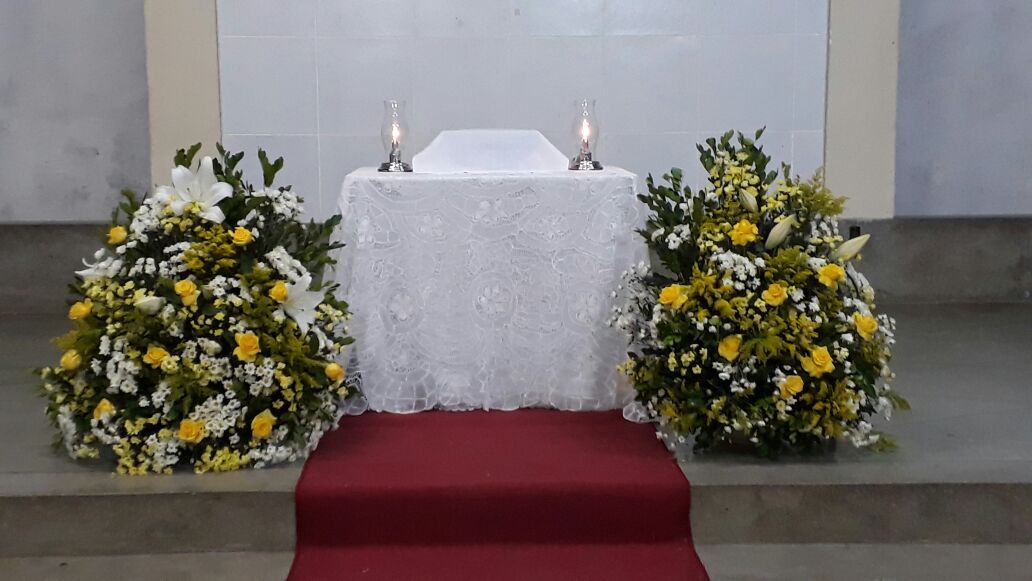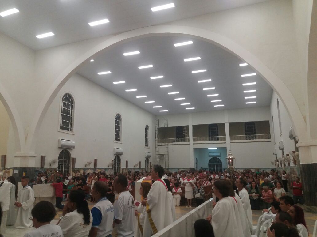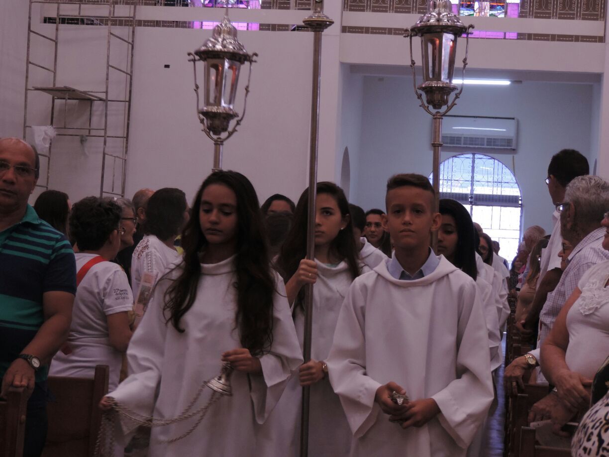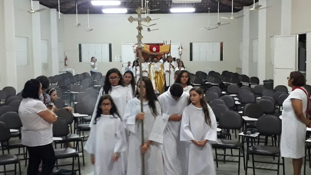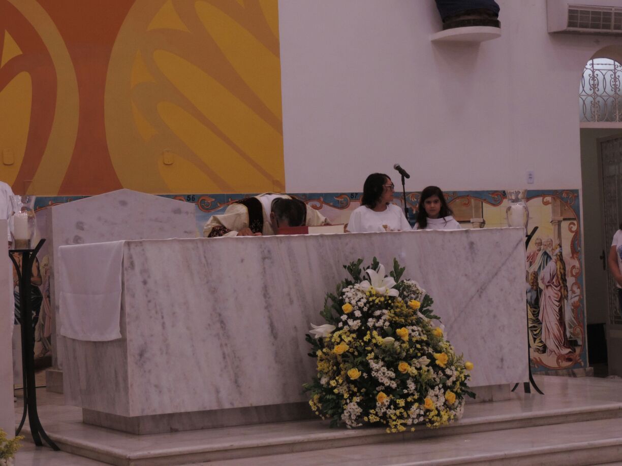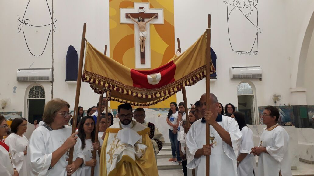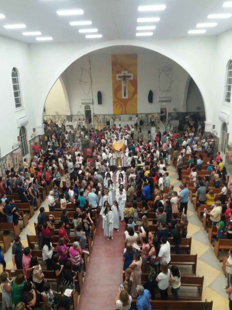 Após a comunhão em momento de profundo siléncio e oração as reservas eucaristicas foram retiradas do Sacrário e foram transladadas em procissão com todos os fieis presentes em direção ao salão paroquial onde ficou em Adoração até as 23hs.