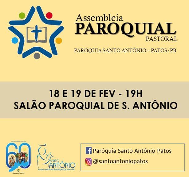 A Assembléia Paroquial Pastoral 2019 aconteceu nos dias 18 e 19 de fevereiro, às 19h, no Salão paroquial. O Encontro contou com a presença das pastorais e movimentos de toda a Paróquia. Momento oportuno para refletir e planejar as atividades missionárias.